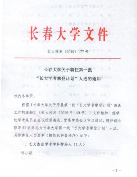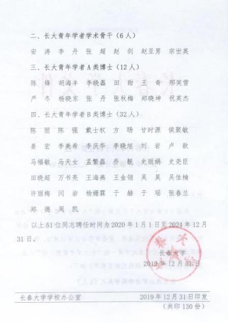 2019年12月31日,学校印发长大校发[2019]177号文件《欧冠中文官网关于聘任第一批“长大学者攀登计划”人选的通知》。学院教师张丹被聘任为“长大青年学者A类博士”;学院教师杨姗霖、张春兰被聘任为“长大青年学者B类博士”。