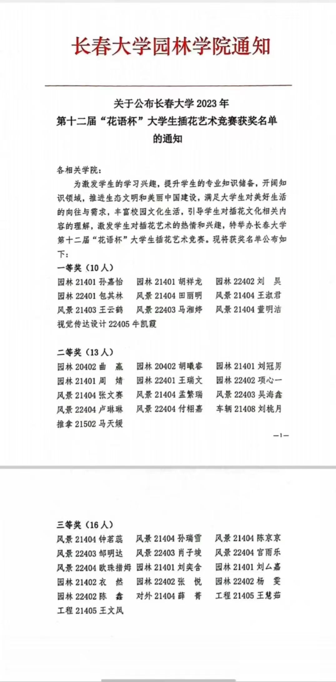 最终评审确定欧冠中文官网第十二届“花语杯”插花艺术竞赛获奖的39名同学。