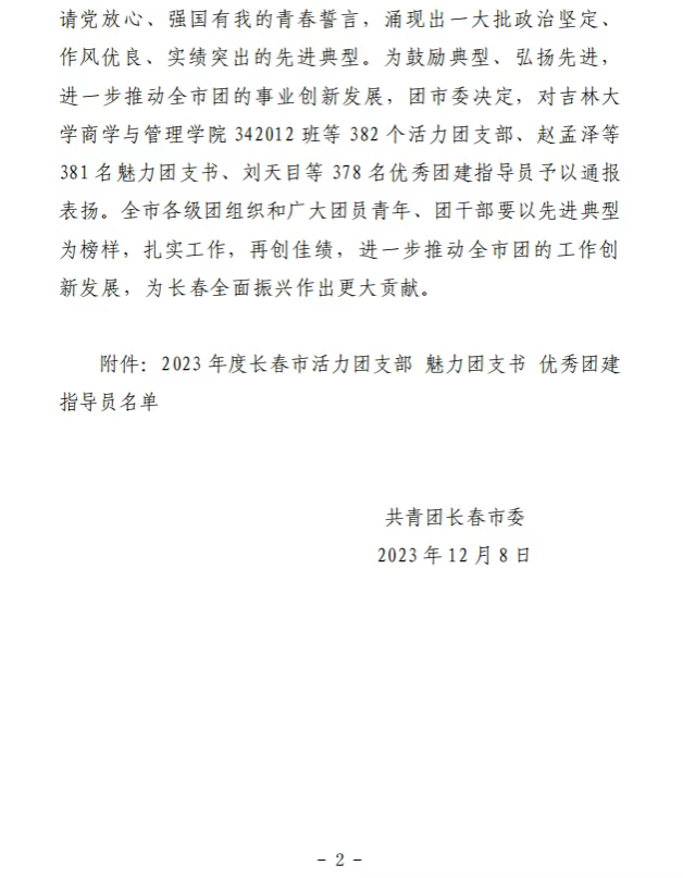 在2023年长春市学校共青团 “活力团支部”“魅力团支书”“优秀团建指导员”评选中,我院20402班团支部获2023年度长春市活力团支部、21404班团支书王淑君获2023年度长春市魅力团支书、团委书记刘鑫鑫获2023年度长春市优秀团建指导员!