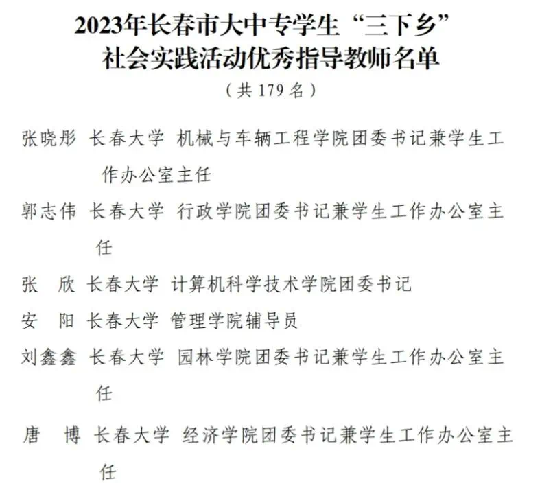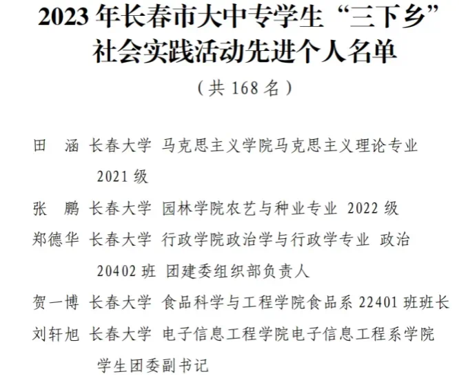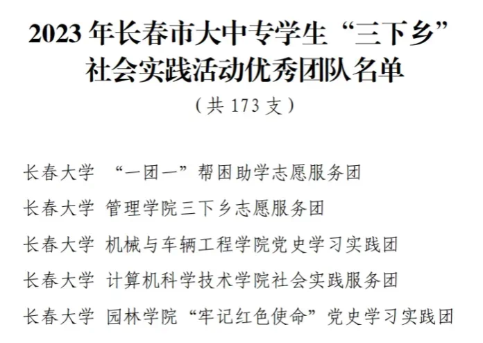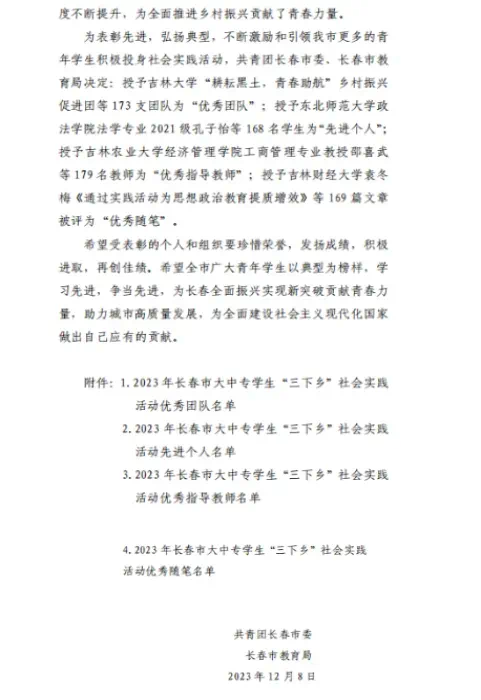 近日,共青团长春市委、长春市教育局发布《关于表彰 2023 年长春市大中专学生“三下乡”社会实践活动优秀团队和个人的决定》,我院“牢记服务使命”党史学习实践团获评2023年长春市大中专学生“三下乡”社会实践活动优秀团队、农艺与种业2022级研究生张鹏获评2023年长春市大中专学生“三下乡”社会实践活动先进个人、团委书记刘鑫鑫获评2023年长春市大中专学生“三下乡”社会实践活动优秀指导教师。