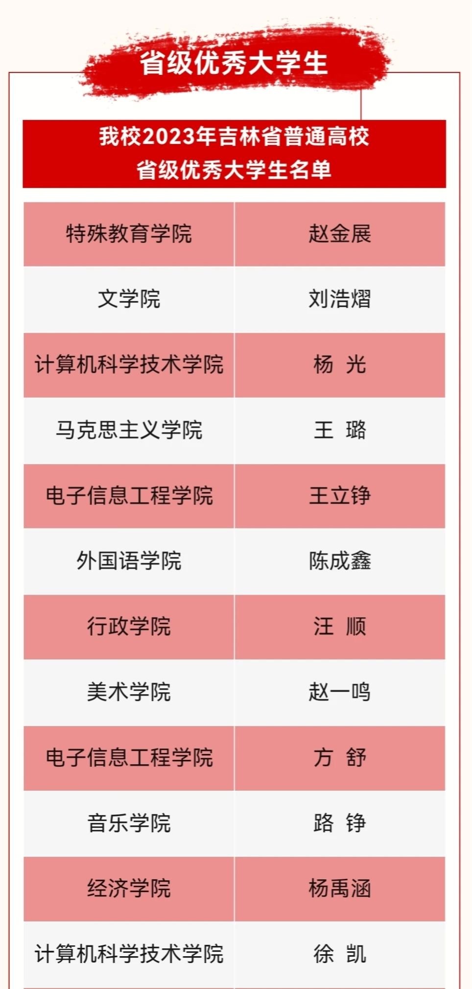根据《关于开展2023年吉林省普通高校省级优秀大学生(标兵)、优秀学生干部(标兵)和先进班集体推荐选树工作的通知》要求,经学校逐级申报,省选树工作领导小组审核、公示,我院风景园林专业2020级学生王雪荣获“2023年吉林省普通高校省级优秀大学生”荣誉称号。