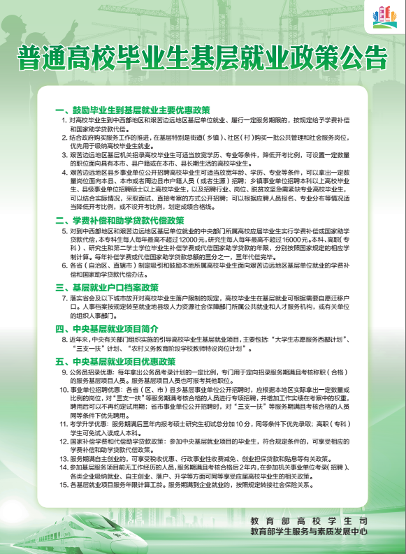 转发:普通高校毕业生基层就业、应征入伍、自主创业政策公告