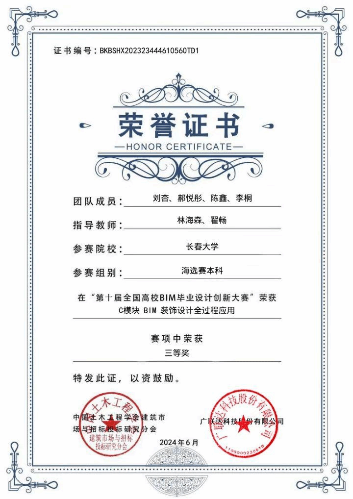 学院师生团队在”第十届全国高校BIM毕业设计创新大赛”荣获C模块BIM 装饰设计全过程应用赛项中荣获三等奖
