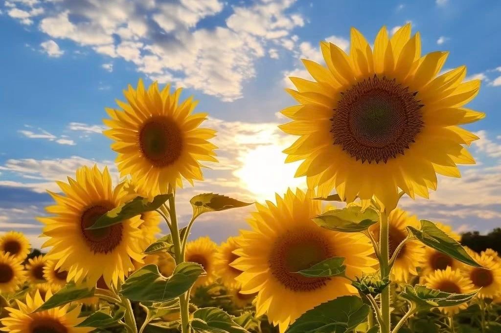 向日葵是一年生草本植物,植株高大。茎直立,粗壮且被白色粗硬毛。其花大而醒目,黄色的舌状花围绕着棕色的管状花,花序会随太阳转动。它原产于北美洲,种子可榨油,也能直接食用,兼具观赏和经济价值 。