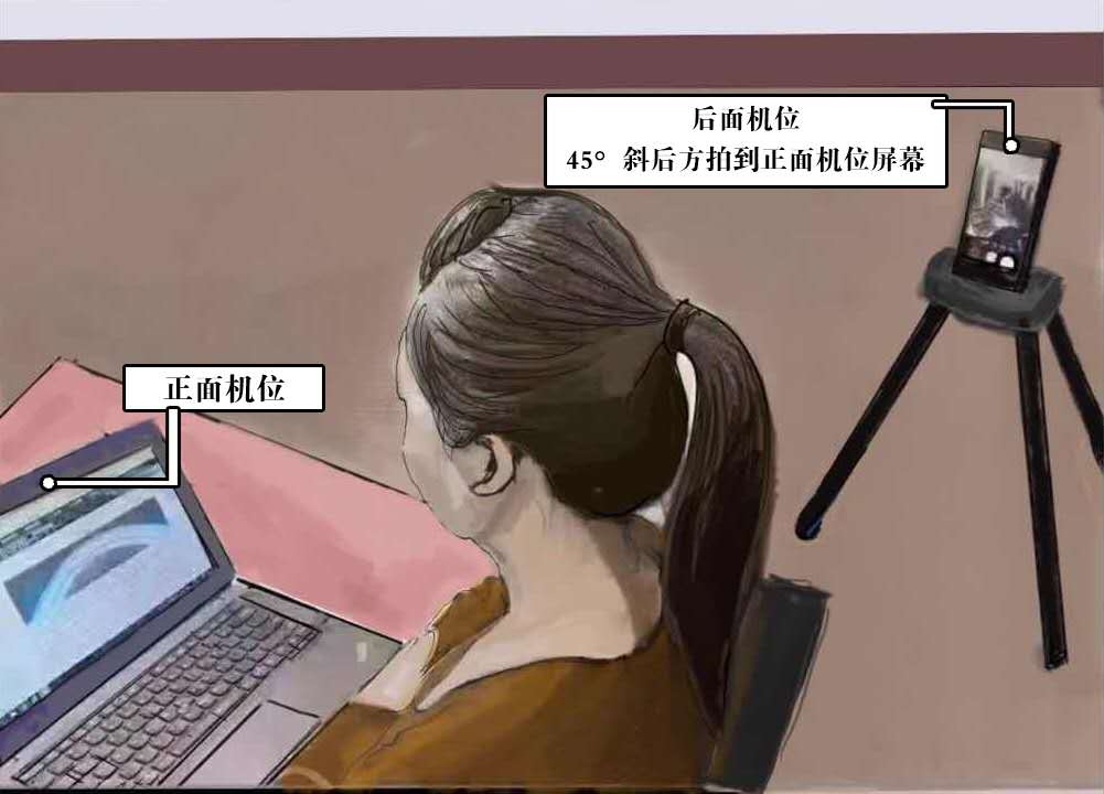(2)考生的第一台为主设备,用于人脸识别、身份验证、查看试题,要求放置在考生座位正前方,视频监控范围应保证考生在坐姿状态下能够完整清晰覆盖头部到桌面位置;另一台为辅助设备。须打开两台设备的视频功能。