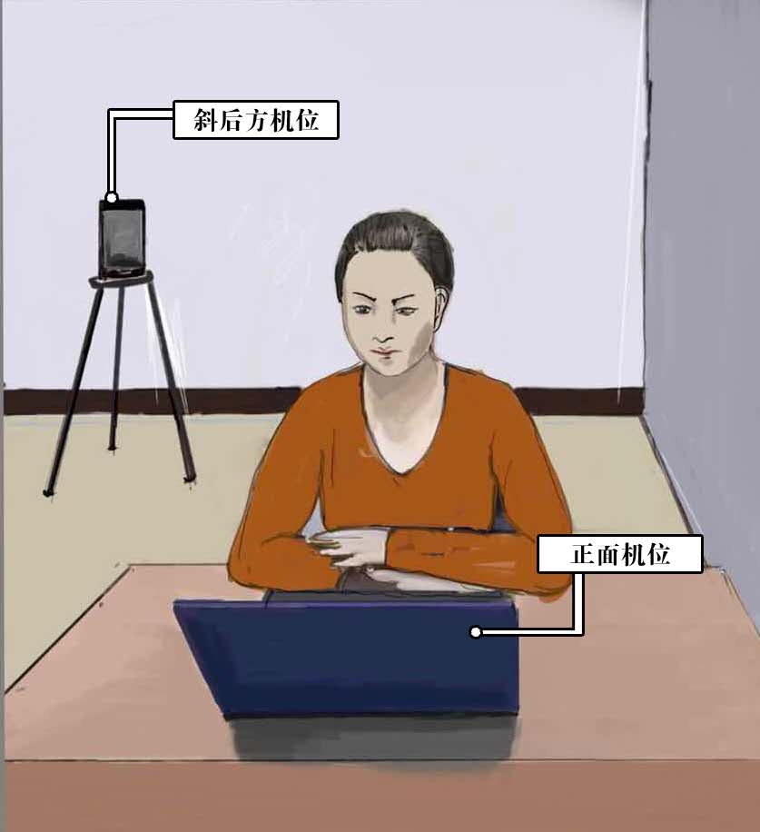 ①第一机位为面试主机位。面向考生,用于复试专家对考生的远程视频考核(建议使用带有线网络的笔记本电脑或台式机加摄像头、麦克风、音箱,也可为平板电脑)。放置面试主机位的书桌应紧贴墙面摆放。桌面上只允许摆放面试设备和报考学院要求准备的其它考试用品。复试全程应保证设备电量充足,网络连接正常。考生端两台设备均开启摄像头。考生本人正对设备摄像头,保持坐姿端正,面部、上半身在画面中要清晰可见。面试时考生本人应保持发型整洁,素颜、露耳、束发、不可佩戴帽子、墨镜、口罩、不可佩戴首饰,面试不得使用耳机。复试全程考生应保持注视摄像头,视线不得离开,不得中途离场。